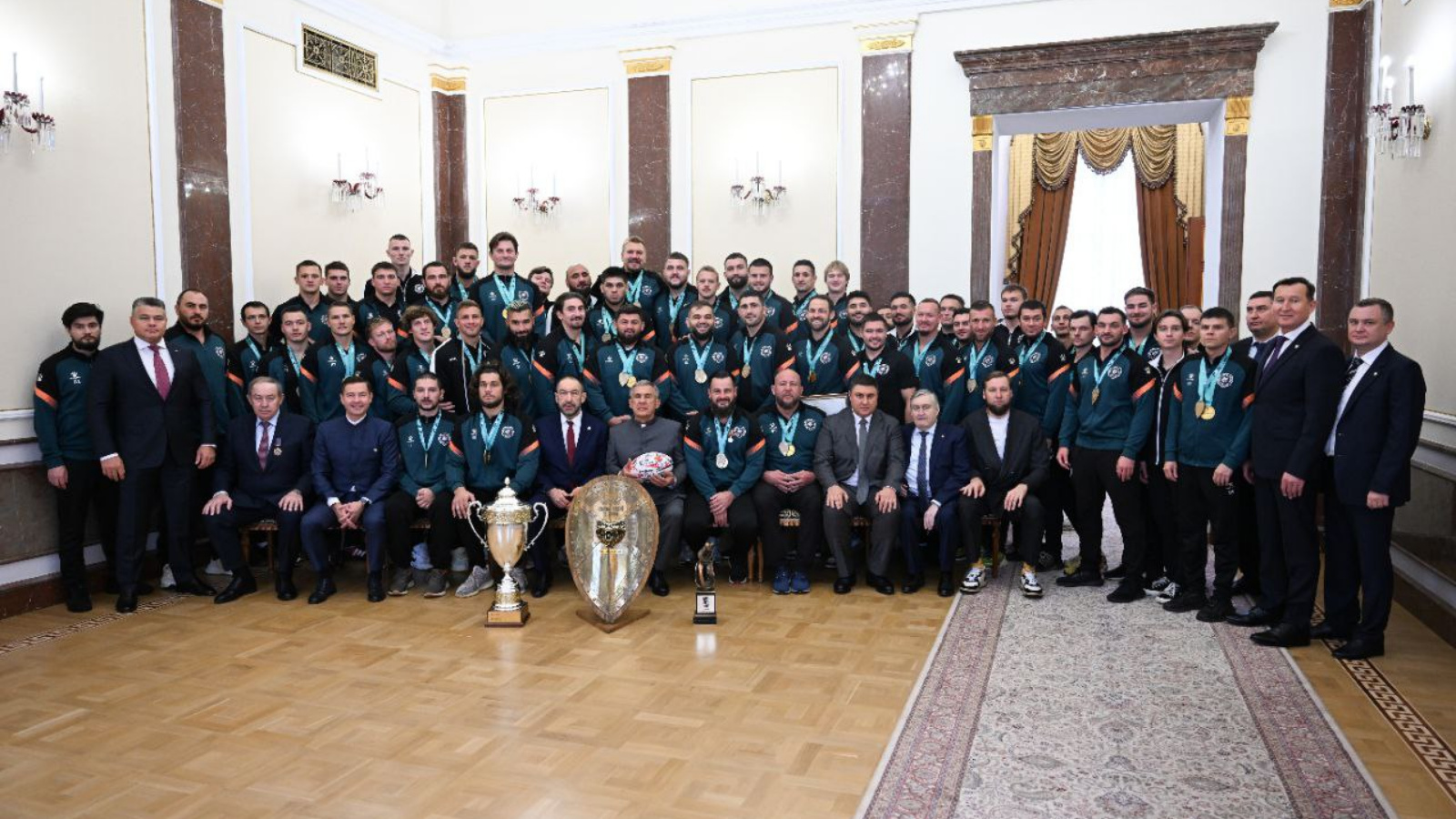 «Уважаемые игроки, тренеры, руководители клуба! Рад приветствовать вас в Казанском Кремле в этот особенный для всех день – сегодня мы чествуем наших чемпионов, регбийный клуб «Стрела – Ак Барс», который завоевал все главные трофеи страны в сезоне 2025 года, - сказал в приветственном слове Рустам Минниханов. – Эти победы стали результатом огромной работы, силы духа и высочайшего мастерства. Решающий матч чемпионата был упорным, зрелищным и захватывающим. Он держал в напряжении до самого финала и принес первый для клуба титул чемпионов страны».