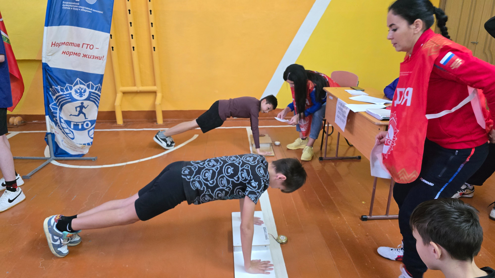 В течение двух дней нормативы выполнили 500 учащихся с 1 по 11 класс. Школьники сдавали шесть дисциплин: сгибание и разгибание рук в упоре лежа, наклон вперёд из положения стоя, прыжок в длину с места, подтягивание на высокой перекладине, поднимание туловища из положения лежа и стрельбу из электронного оружия.