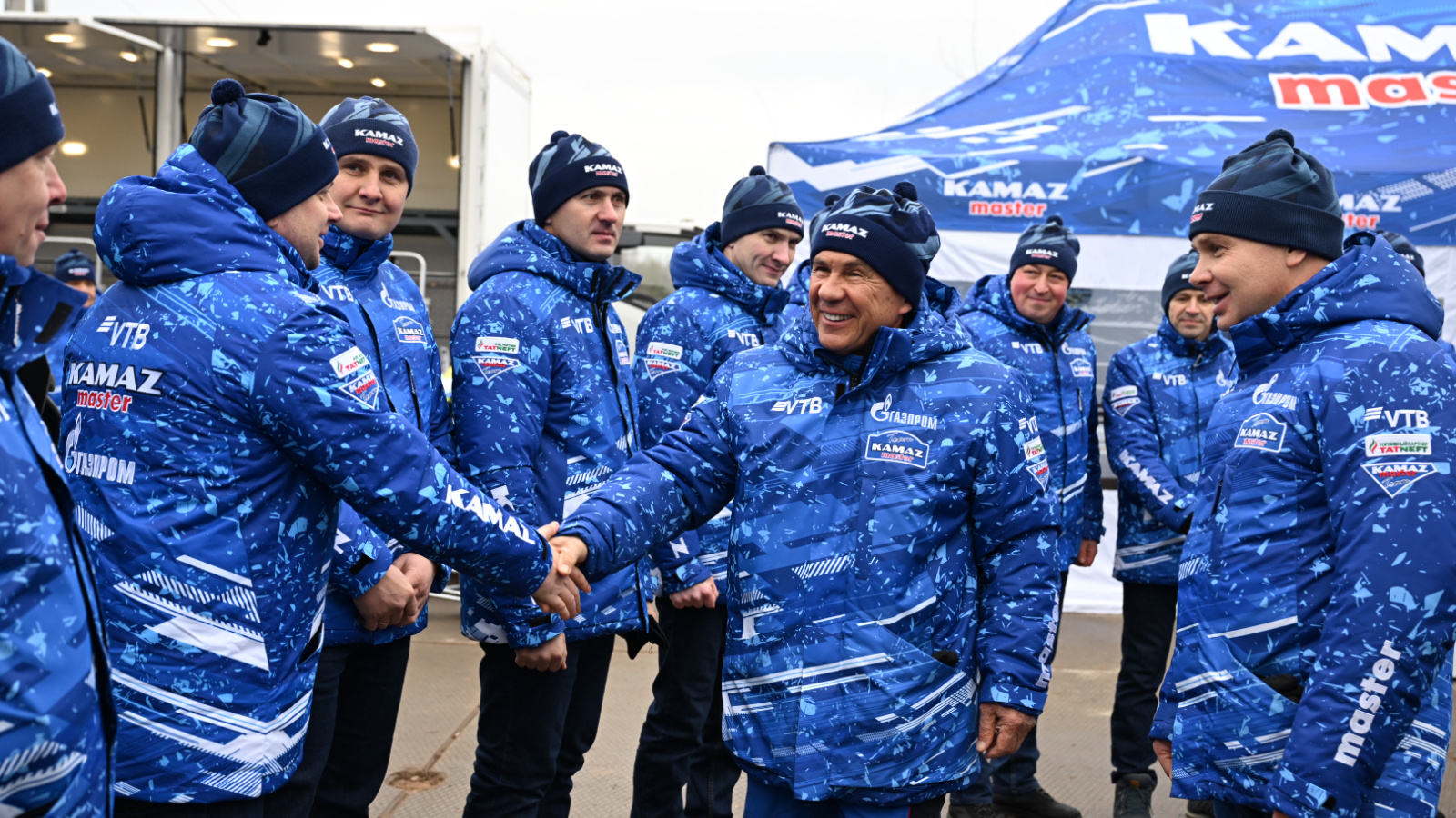 Раис Татарстана Рустам Минниханов встретился со спортсменами и руководством команды «КАМАЗ-Мастер» на спортивном полигоне Тарловка. Его сопровождали генеральный директор ПАО «КАМАЗ» Сергей Когогин, руководитель команды «КАМАЗ-Мастер» Эдуард Николаев, мэр Набережных Челнов Наиль Магдеев и другие.