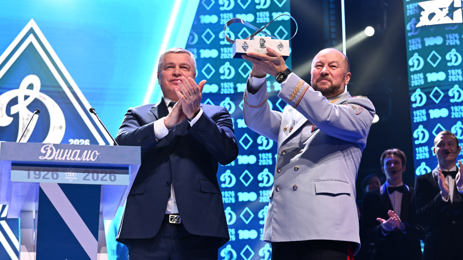 Участникам торжественных мероприятий были продемонстрированы видеоролики, посвященные истории «Динамо» и именитым спортсменам, а также историям побед.