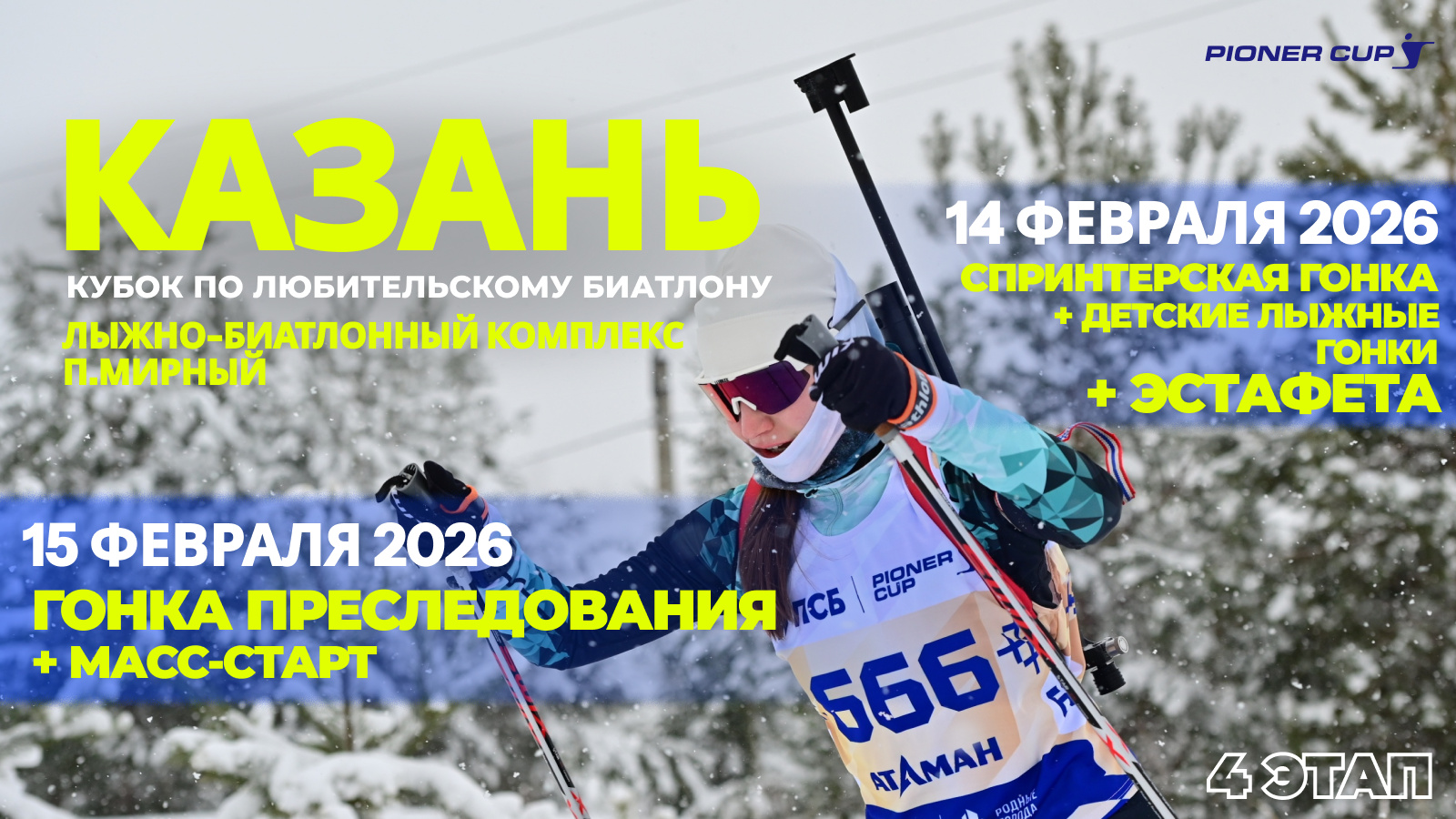 В рамках реализации Государственной программы «Спорт России» в Республике Татарстан пройдет четвертый этап Всероссийского кубка по любительскому биатлону Pioner Cup. Более 860 спортсменов из 55 городов России соберутся 14 и 15 февраля на трассе лыжно-биатлонного комплекса в п. Мирный.