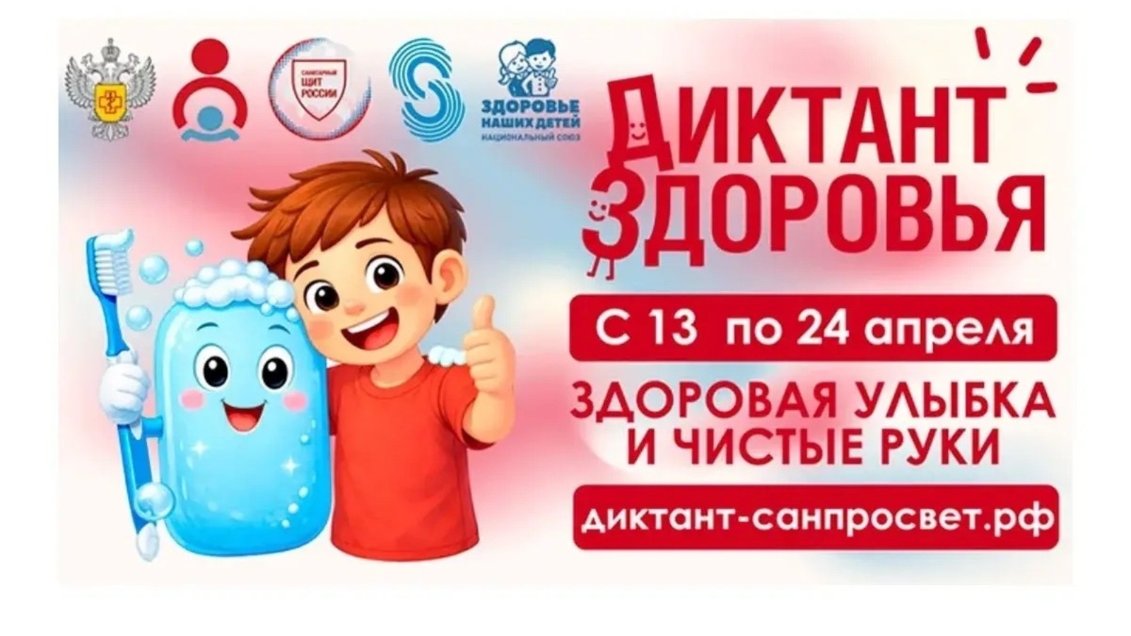 С 13 по 24 апреля 2026 года Роспотребнадзор запускает первый тематический трек Всероссийской санитарно-просветительской акции «Диктант здоровья» — «Здоровая улыбка и чистые руки».